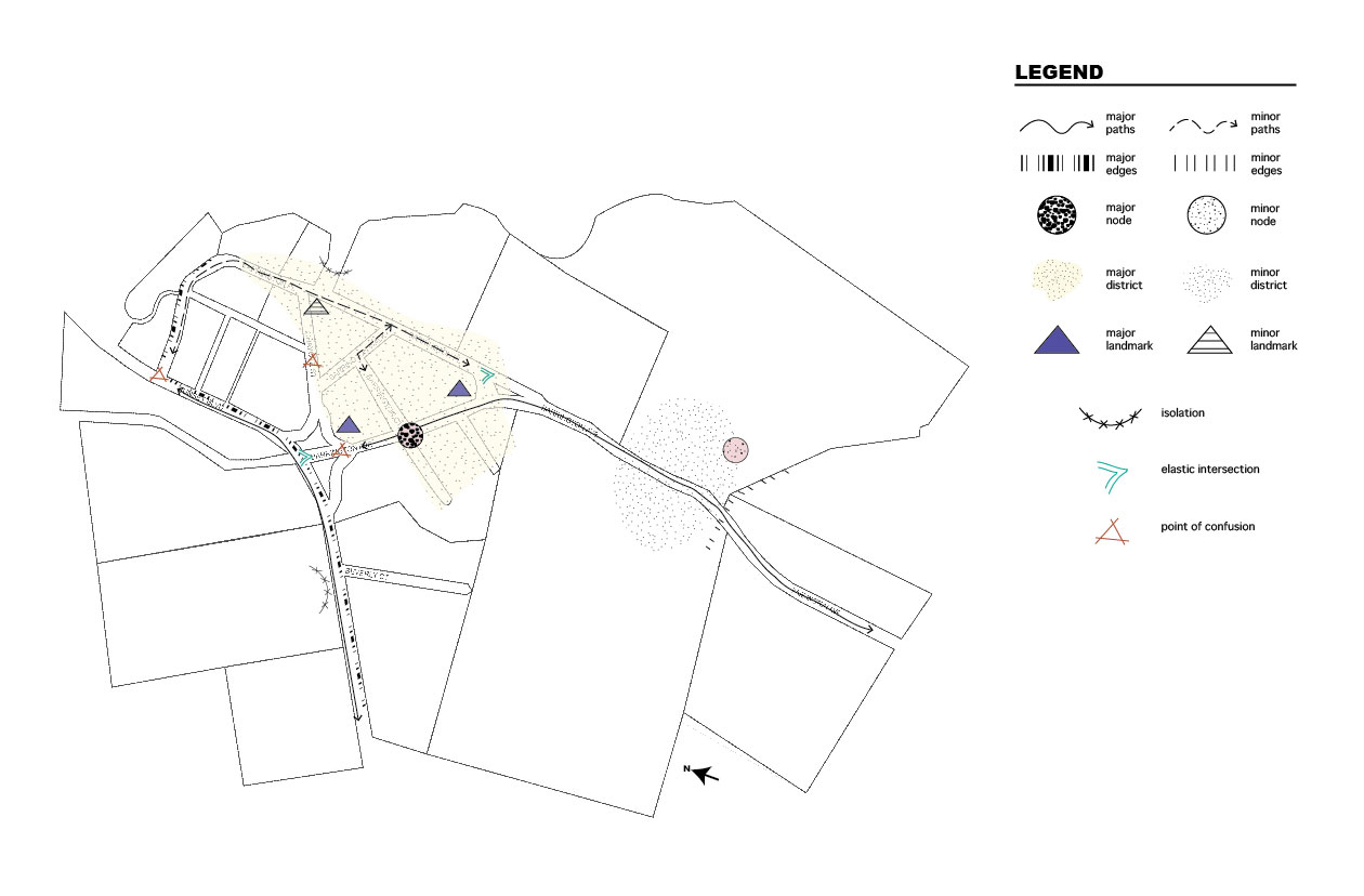 Lynch Analysis Illustrator Constructed map applying Kevin Lynch’s framework for legibility and image-ability of a city form. Map informed by personal observation and perspective. Westwood Village, CA.